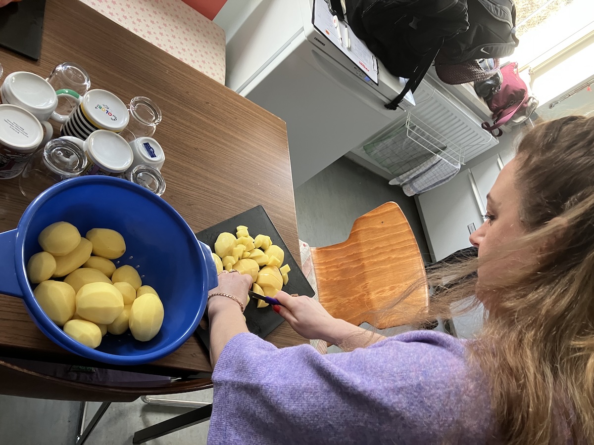Antonina aus der Ukraine hatte uns das Rezept geliefert und mit uns geschnipselt und gekocht. Die Aktion fand in der Küche des Stadtgartens Bebelhof statt. Hier finden ca. 15 Personen Platz zum gemeinsamen Kochen und Essen.