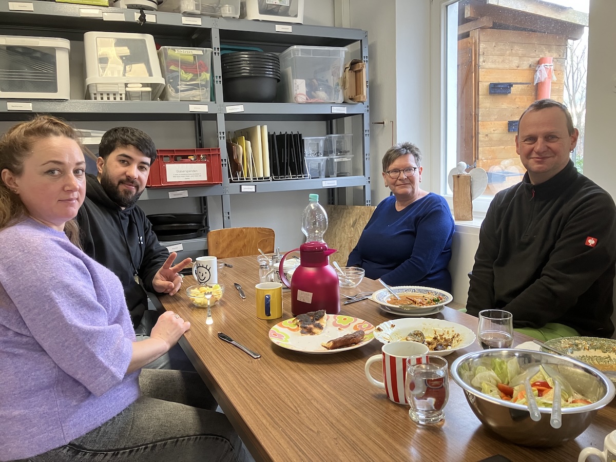 Wir haben diesmal ein Borschtsch gekocht und gegessen. Das Rezept kam von Antonina aus der Ukraine. Das Borschtsch, aus u.a. Roter Beete, Karotten, Kartoffeln und Kohl, wurde vegetarisch zubereitet, dazu gab es Hähnchen (wer welches wollte).